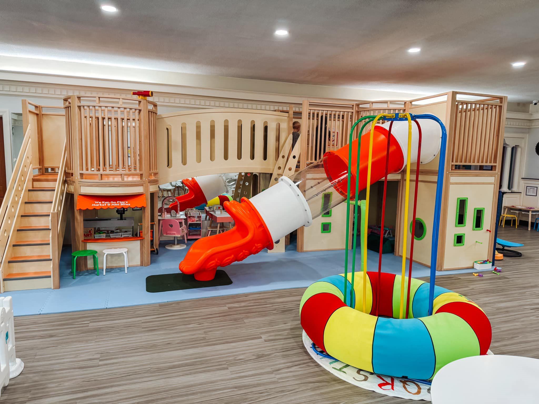 There are manipulatives and dramatic play areas which you can engage with your child, however, adults are not allowed on the play structures and slides.