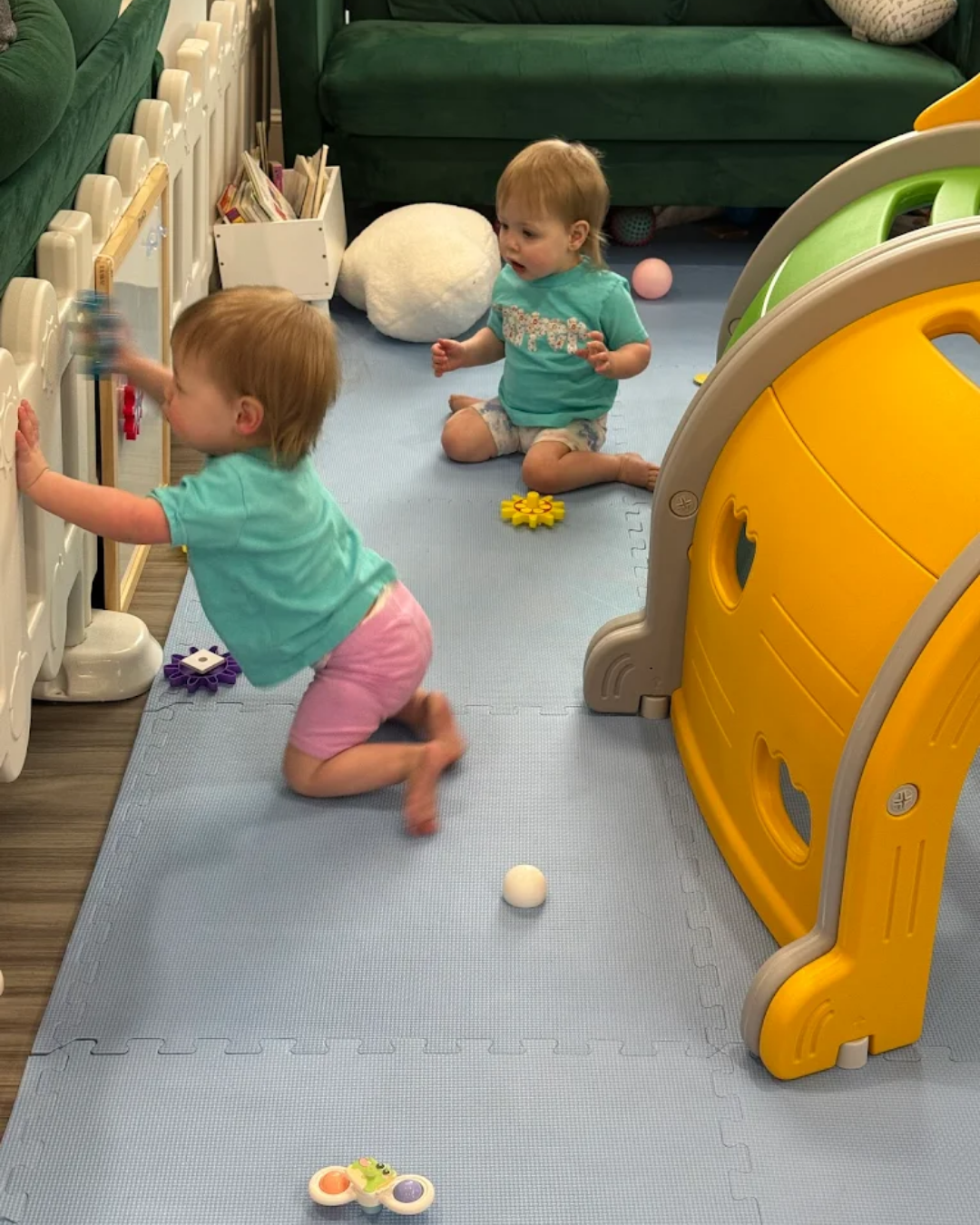 Early play encourages movement and discovery 🌼 Little ones crawl, scoot, and explore in a safe, open environment. Every new reach builds strength and curiosity. Growth happens naturally through play. #EarlyLearning #GrossMotorSkills #WeKanGoPlay #ToddlerDevelopment #PlayToGrow